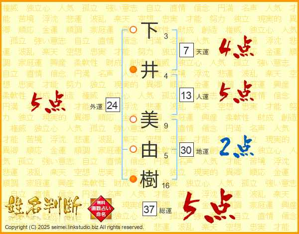 下井美由樹さんの総運は37画の5点!