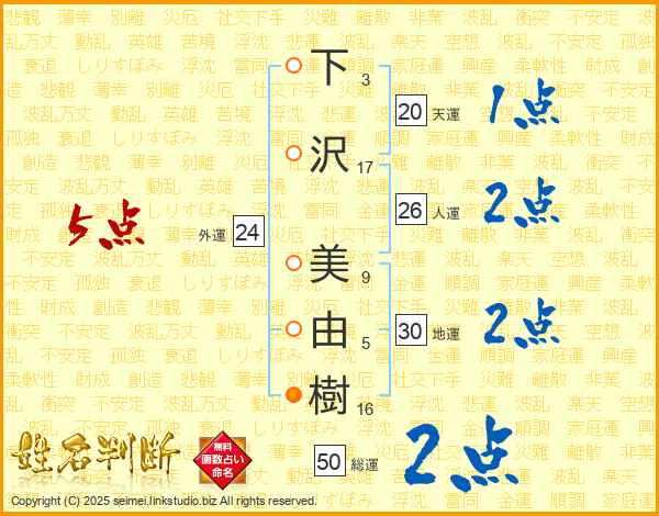 下(3画)沢(17画) 美(9画)由(5画)樹(16画)