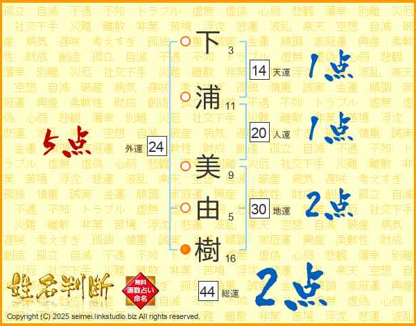下(3画)浦(11画) 美(9画)由(5画)樹(16画)