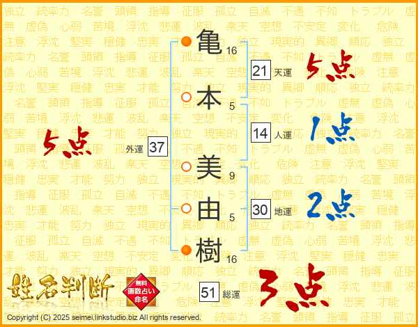 亀(16画)本(5画) 美(9画)由(5画)樹(16画)