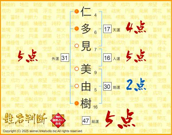 仁(4画)多(6画)見(7画) 美(9画)由(5画)樹(16画)