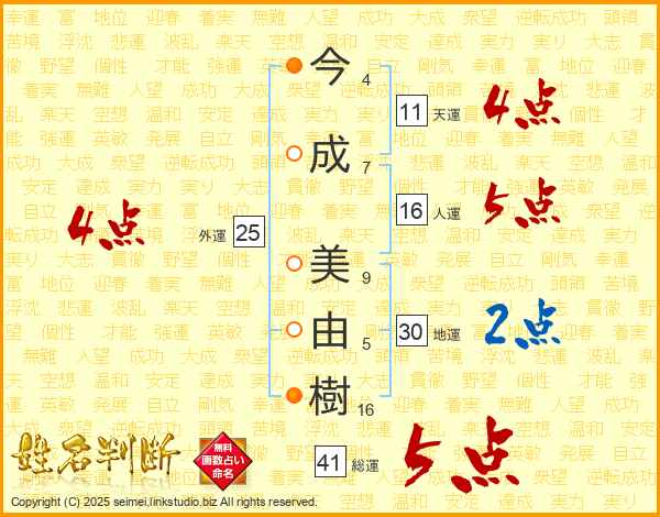 今(4画)成(7画) 美(9画)由(5画)樹(16画)