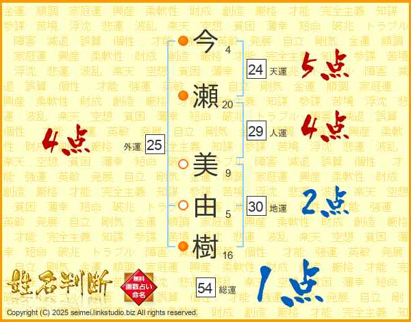 今(4画)瀬(20画) 美(9画)由(5画)樹(16画)