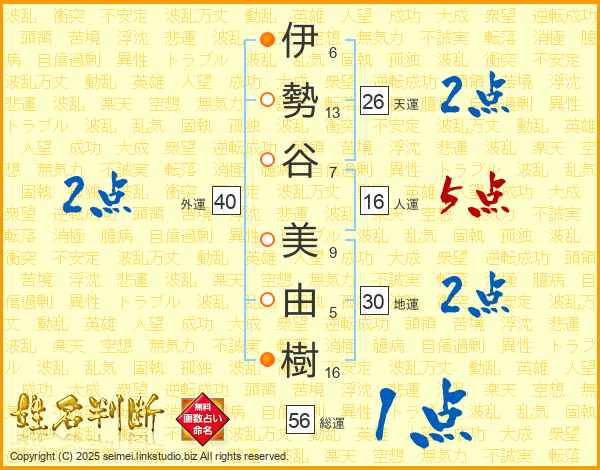 伊(6画)勢(13画)谷(7画) 美(9画)由(5画)樹(16画)
