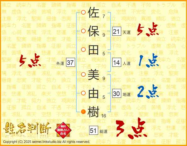 佐(7画)保(9画)田(5画) 美(9画)由(5画)樹(16画)