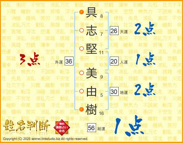 具(8画)志(7画)堅(11画) 美(9画)由(5画)樹(16画)