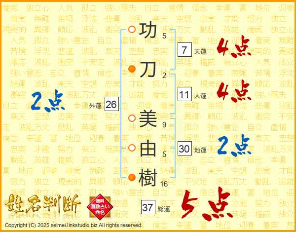 功(5画)刀(2画) 美(9画)由(5画)樹(16画)