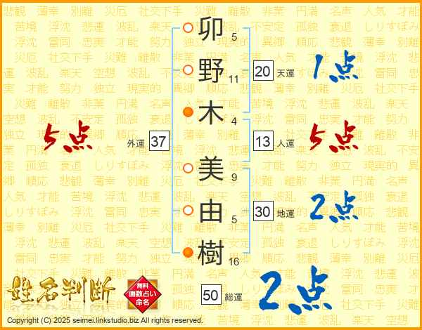 卯(5画)野(11画)木(4画) 美(9画)由(5画)樹(16画)