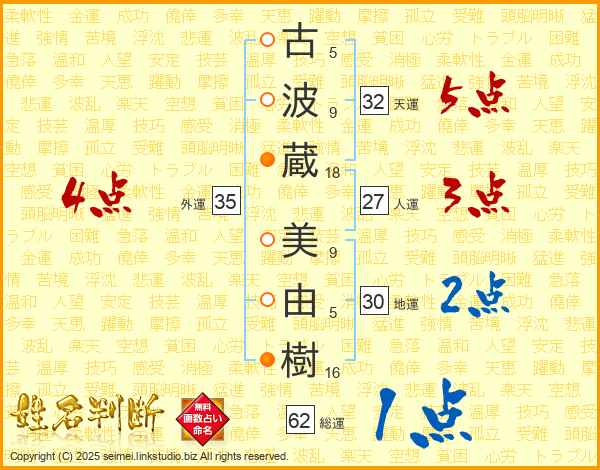 古(5画)波(9画)蔵(18画) 美(9画)由(5画)樹(16画)
