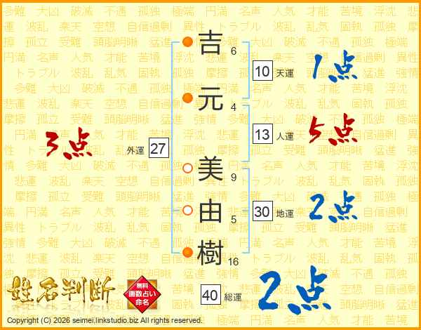 吉(6画)元(4画) 美(9画)由(5画)樹(16画)