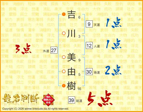 吉川美由樹さんの総運は39画の5点!