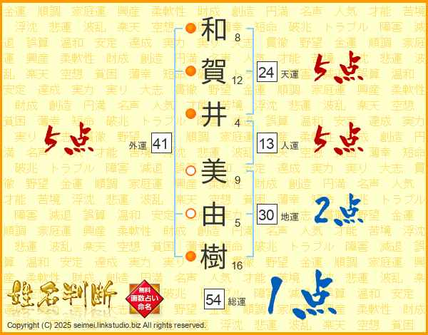 和(8画)賀(12画)井(4画) 美(9画)由(5画)樹(16画)