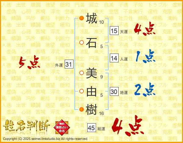 城(10画)石(5画) 美(9画)由(5画)樹(16画)