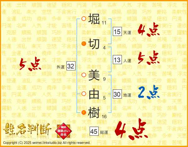 堀(11画)切(4画) 美(9画)由(5画)樹(16画)