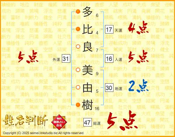 多(6画)比(4画)良(7画) 美(9画)由(5画)樹(16画)