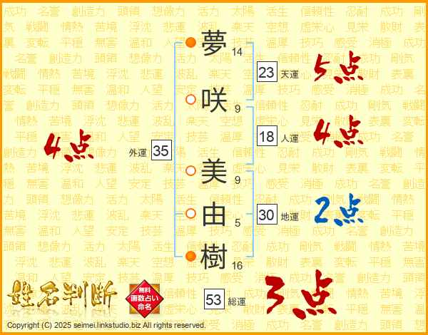 夢(14画)咲(9画) 美(9画)由(5画)樹(16画)