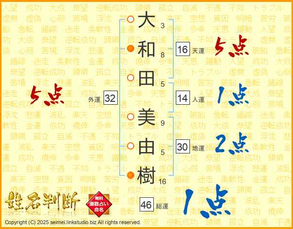 大(3画)和(8画)田(5画) 美(9画)由(5画)樹(16画)