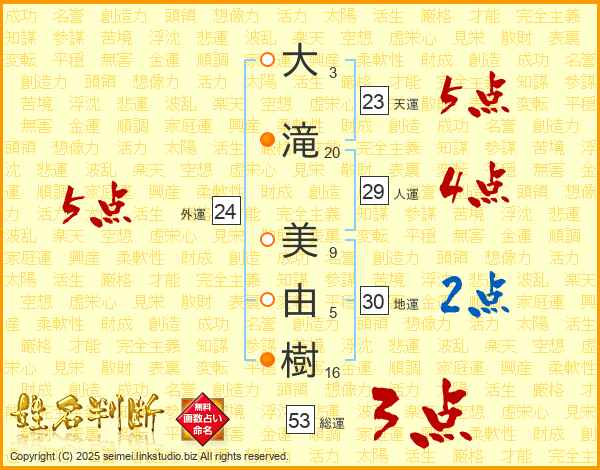 大(3画)滝(20画) 美(9画)由(5画)樹(16画)