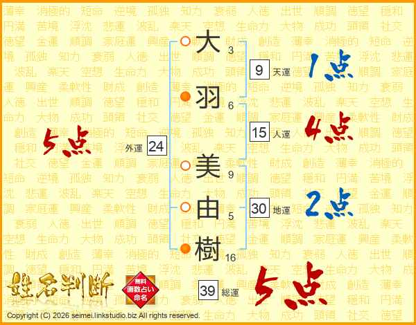 大羽美由樹さんの総運は39画の5点!