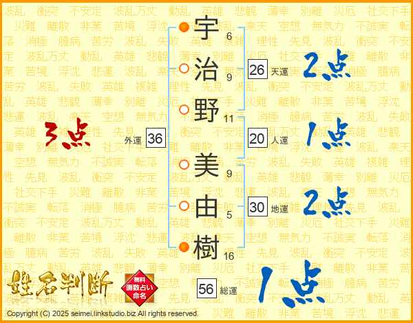 宇(6画)治(9画)野(11画) 美(9画)由(5画)樹(16画)