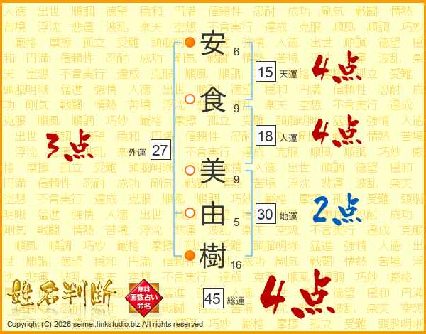 安(6画)食(9画) 美(9画)由(5画)樹(16画)