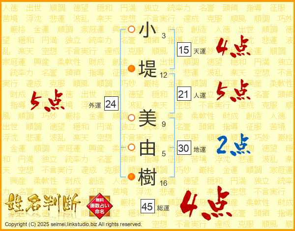 小(3画)堤(12画) 美(9画)由(5画)樹(16画)