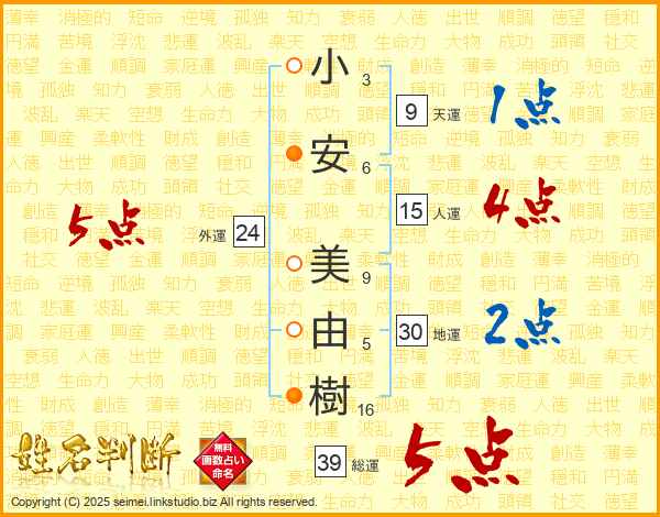 小(3画)安(6画) 美(9画)由(5画)樹(16画)