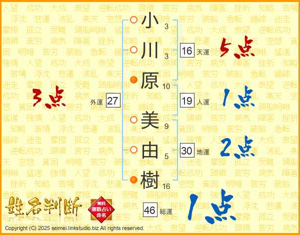 小(3画)川(3画)原(10画) 美(9画)由(5画)樹(16画)