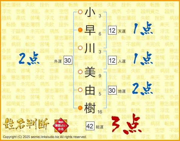 小(3画)早(6画)川(3画) 美(9画)由(5画)樹(16画)