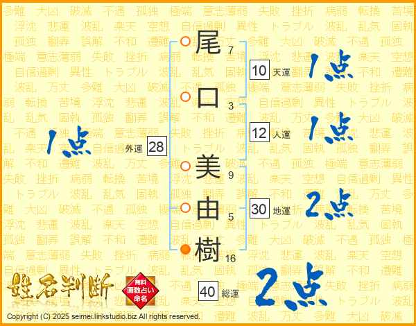 尾(7画)口(3画) 美(9画)由(5画)樹(16画)