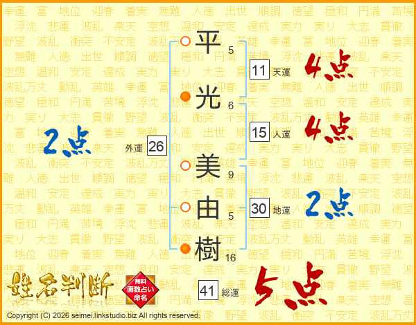 平(5画)光(6画) 美(9画)由(5画)樹(16画)