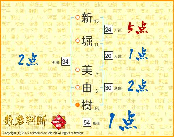 新(13画)堀(11画) 美(9画)由(5画)樹(16画)