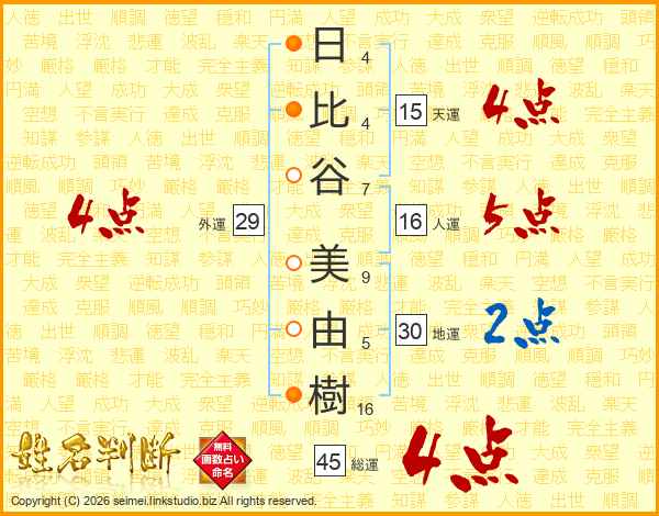 日(4画)比(4画)谷(7画) 美(9画)由(5画)樹(16画)
