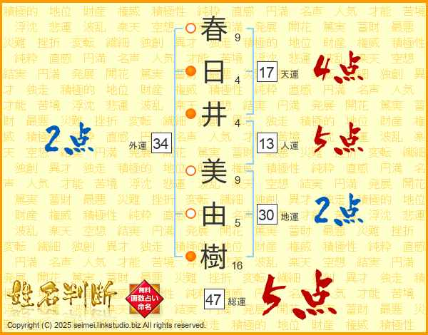 春(9画)日(4画)井(4画) 美(9画)由(5画)樹(16画)