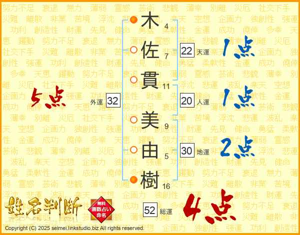 木(4画)佐(7画)貫(11画) 美(9画)由(5画)樹(16画)