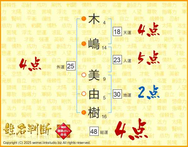 木(4画)嶋(14画) 美(9画)由(5画)樹(16画)