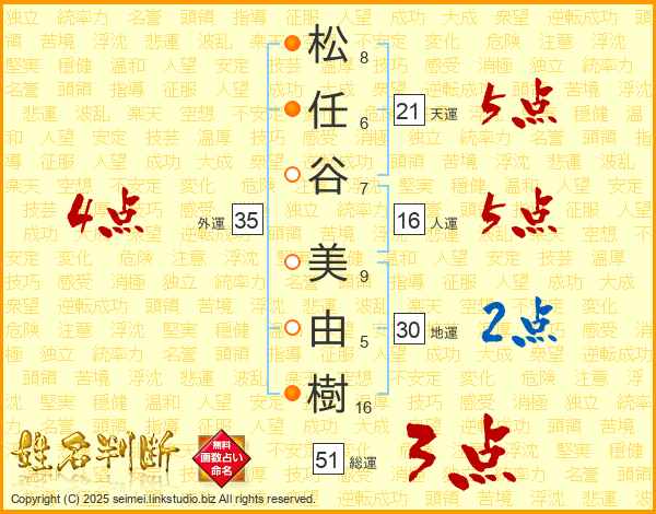松(8画)任(6画)谷(7画) 美(9画)由(5画)樹(16画)