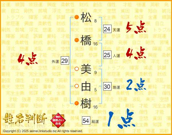 松(8画)橋(16画) 美(9画)由(5画)樹(16画)
