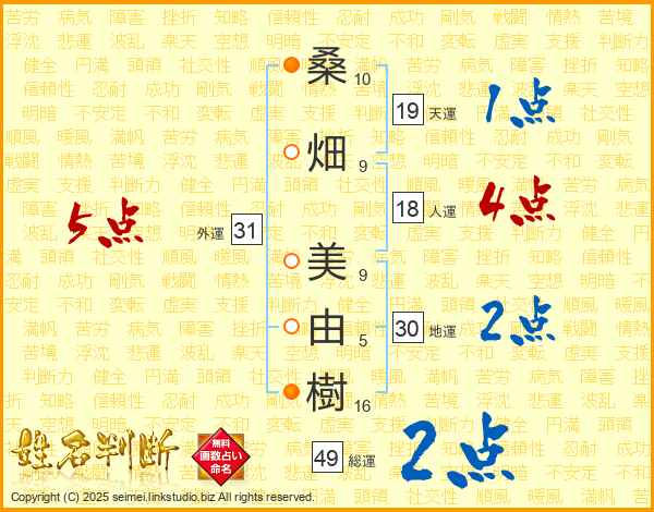 桑(10画)畑(9画) 美(9画)由(5画)樹(16画)
