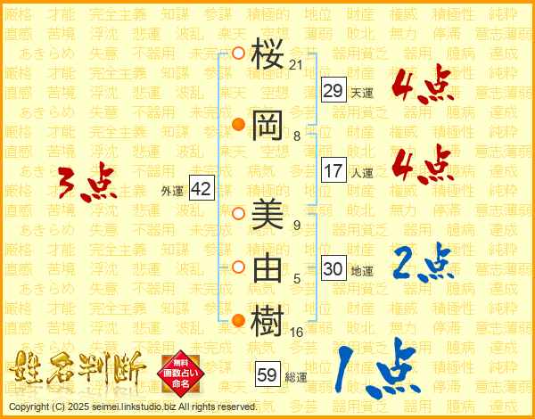 桜(21画)岡(8画) 美(9画)由(5画)樹(16画)