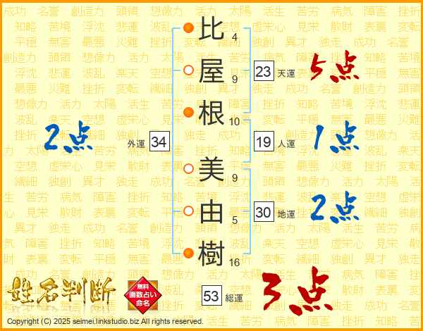 比(4画)屋(9画)根(10画) 美(9画)由(5画)樹(16画)