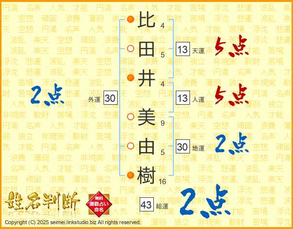 比(4画)田(5画)井(4画) 美(9画)由(5画)樹(16画)