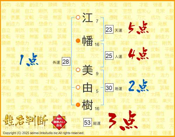 江(7画)幡(16画) 美(9画)由(5画)樹(16画)
