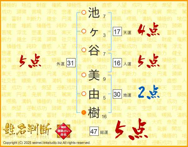 池(7画)ヶ(3画)谷(7画) 美(9画)由(5画)樹(16画)