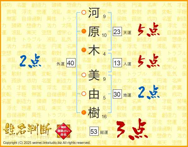 河(9画)原(10画)木(4画) 美(9画)由(5画)樹(16画)