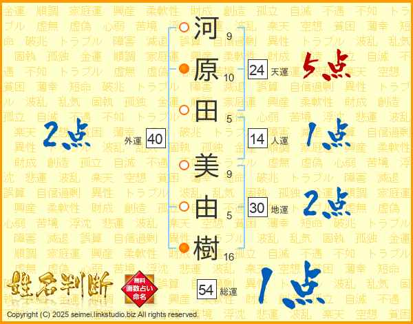 河(9画)原(10画)田(5画) 美(9画)由(5画)樹(16画)