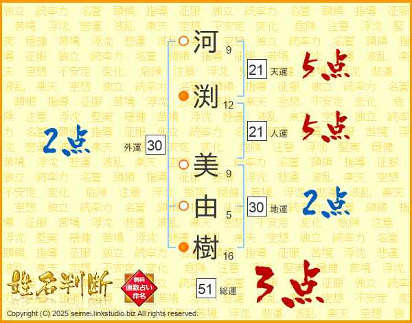 河(9画)渕(12画) 美(9画)由(5画)樹(16画)