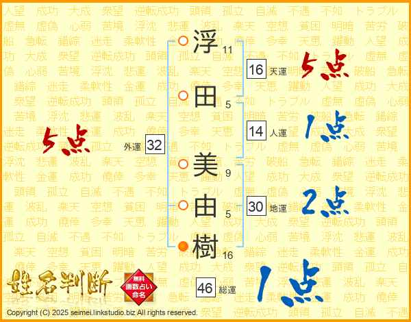 浮(11画)田(5画) 美(9画)由(5画)樹(16画)