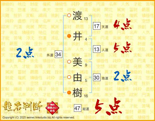 渡(13画)井(4画) 美(9画)由(5画)樹(16画)