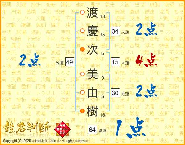 渡(13画)慶(15画)次(6画) 美(9画)由(5画)樹(16画)
